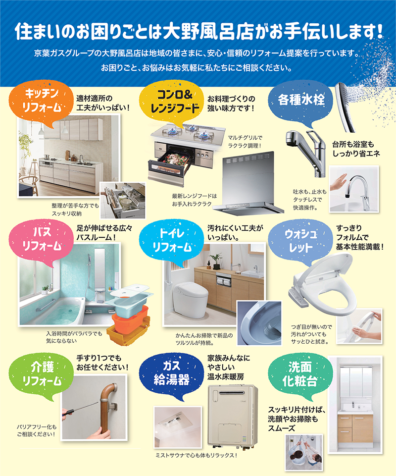 大野風呂店は、地域密着で営業を行い、お客様の住まいのお困りごとや快適リフォームのご提案を行ってまいります。また、介護リフォームのご相談についてもお受けしておりますのでお気軽にお問い合わせください。